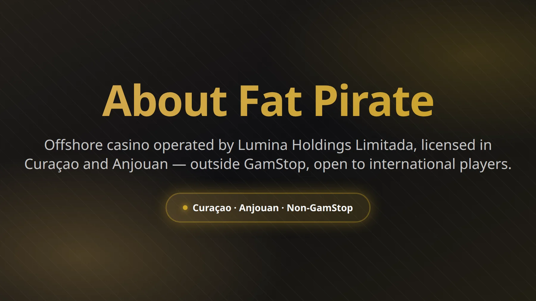 Fat Pirate Casino is the flagship online casino of Lumina Holdings Limitada, a Curaçao-registered operator licensed under the Curaçao / Anjouan regulatory framework. The brand is explicitly offshore and does not hold a UKGC (United Kingdom Gambling Commission) licence. It is also not integrated with GamStop, the UK self-exclusion scheme. If you are a UK player who has self-excluded, please close this page and do not register — there is no platform-level block here, only your own judgement.